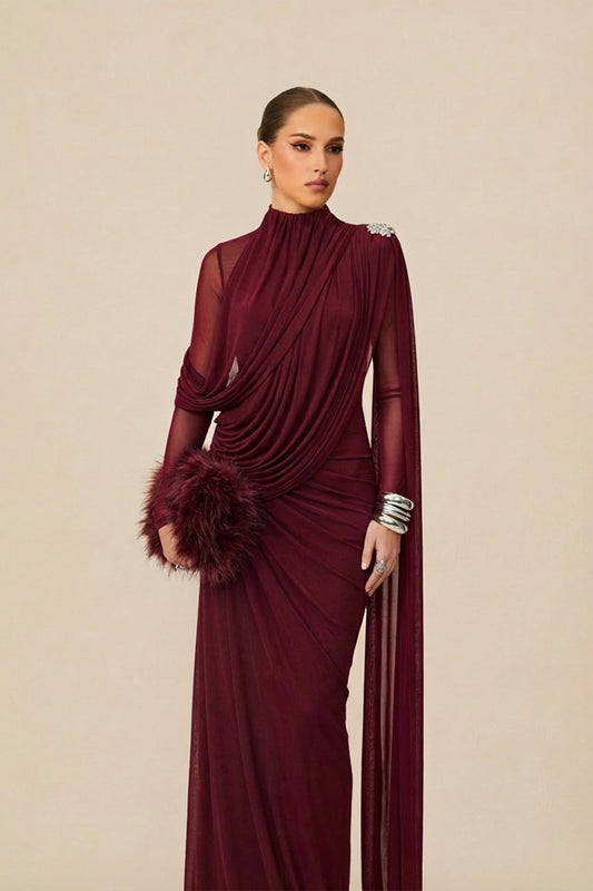 Gala Ready Burgundy Asymmetric Draped Cape Maxi Dress