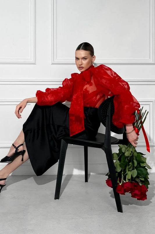 Hulda Lace Bow Tie Lantern Sleeve Blouse