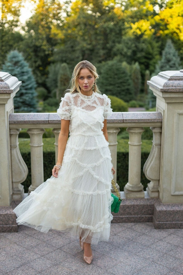 A sweet girl's wardrobe essential - Kinley Ruched Ruffle Hem Maxi Dress. The dress is trimmed with pleats and the fabric is airy and flowy. The waist is slightly tightened to look thinner and add elegance to you. Whether it's a birthday party or a gathering of friends, this simple dress is a great choice.