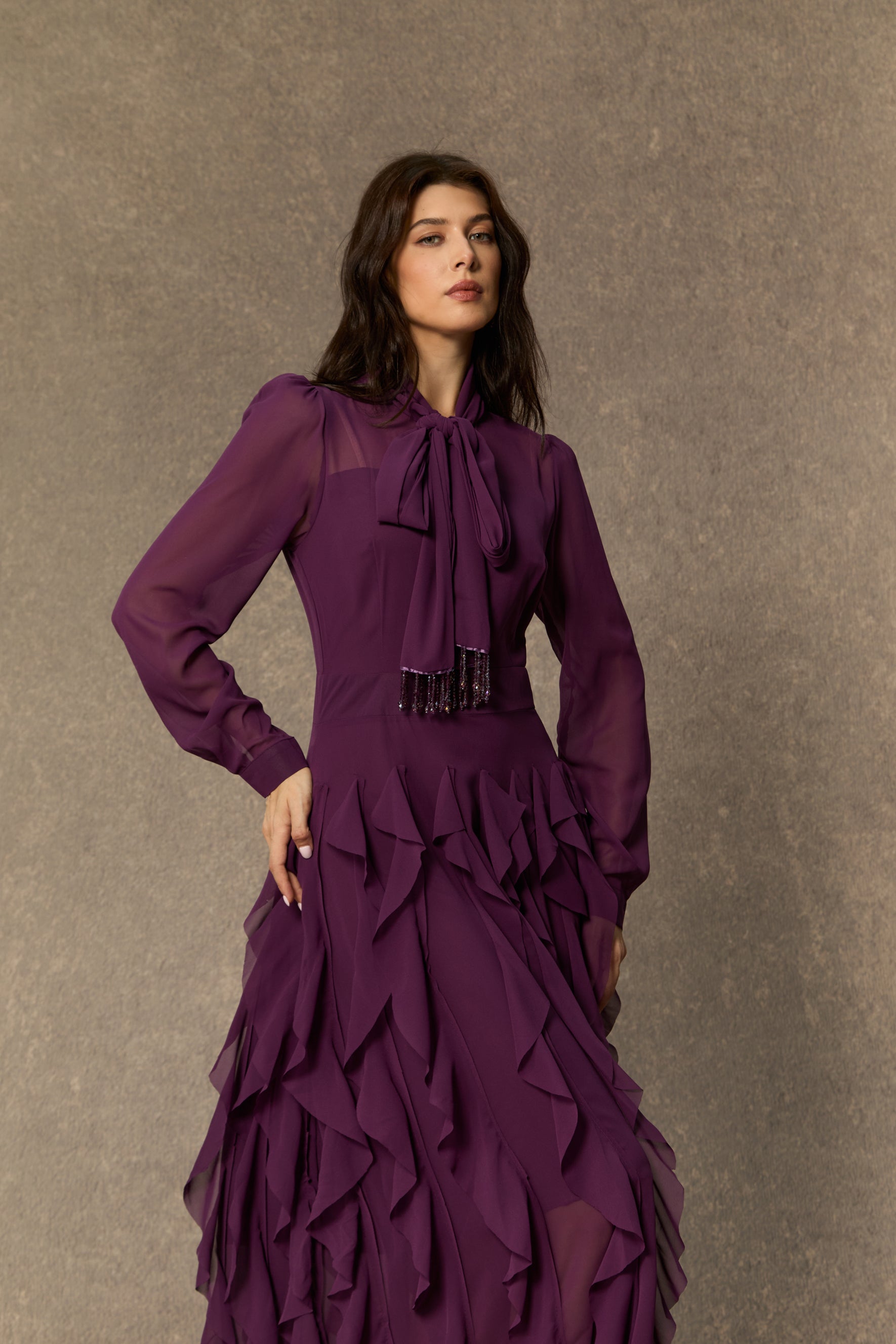 Design: Tie‑Neck Bow, Beaded Fringe, Sheer Long Sleeves, Multi‑Layer Irregular Ruffle, Maxi Length.